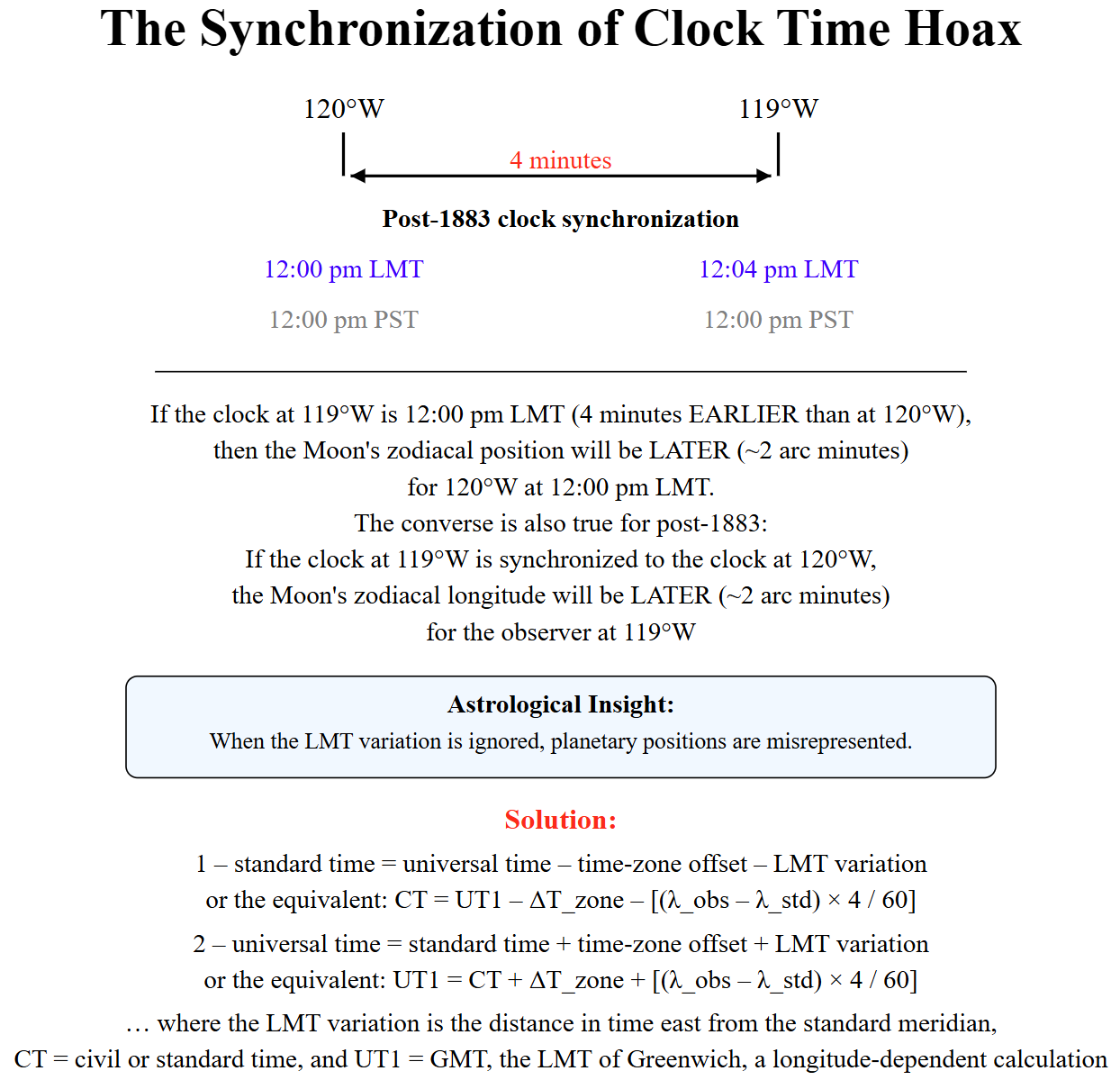 When ephemeris tabulations are based upon 0hr ET (TT), planetary positions are EARLIER in arc than if based upon 0hr UT1 (GMT), due to the ephemeris meridian being “east of the actual meridian of Greenwich,” as Dr. Seidelmann notes in the Explanatory Supplement, p. 76. The analogy of the easterly ephemeris meridian was the basis of our reconstruction of the post-1883 formula for converting CT (civil time) to UT1 (GMT) given here that restores honor to the longitude of the observer, which was always the case with the pre-1883 formula: LMT = UT - longitude (ibid., p. 74). See the infographic below detailing “The Synchronization of Clock Time Hoax” and a more detailed explanation here and debate in the Facebook AA group. The logical reasoning of having an EARLIER Moon for the easterly ephemeris meridian than for the Greenwich Meridian (0°E) was the honor we were obliged to recognize via the proposed formula to an easterly observer’s orientation relative to the westerly standard meridian to which all clocks within the respective time-zone are arbitrarily synchronized.